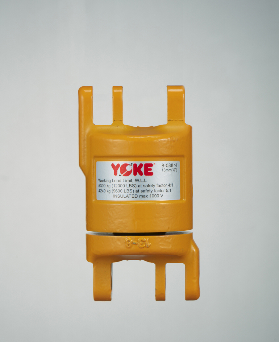 The YOKE 8-088N insulated swivel is available with a complete range of fittings, designed with the unique “Coupling Pin” connections offering a solution for chain, wire rope or synthetic sling terminations.