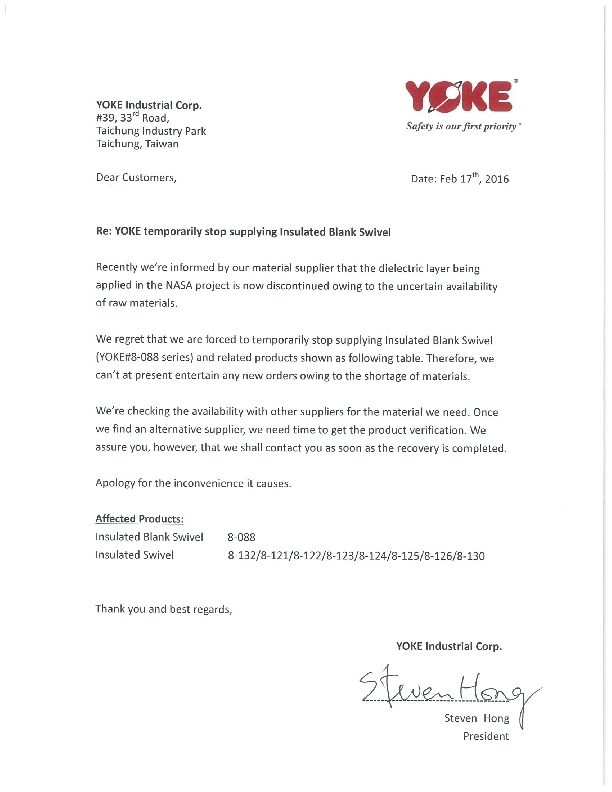 YOKE temporarily stop supplying Insulated Blank Swivel